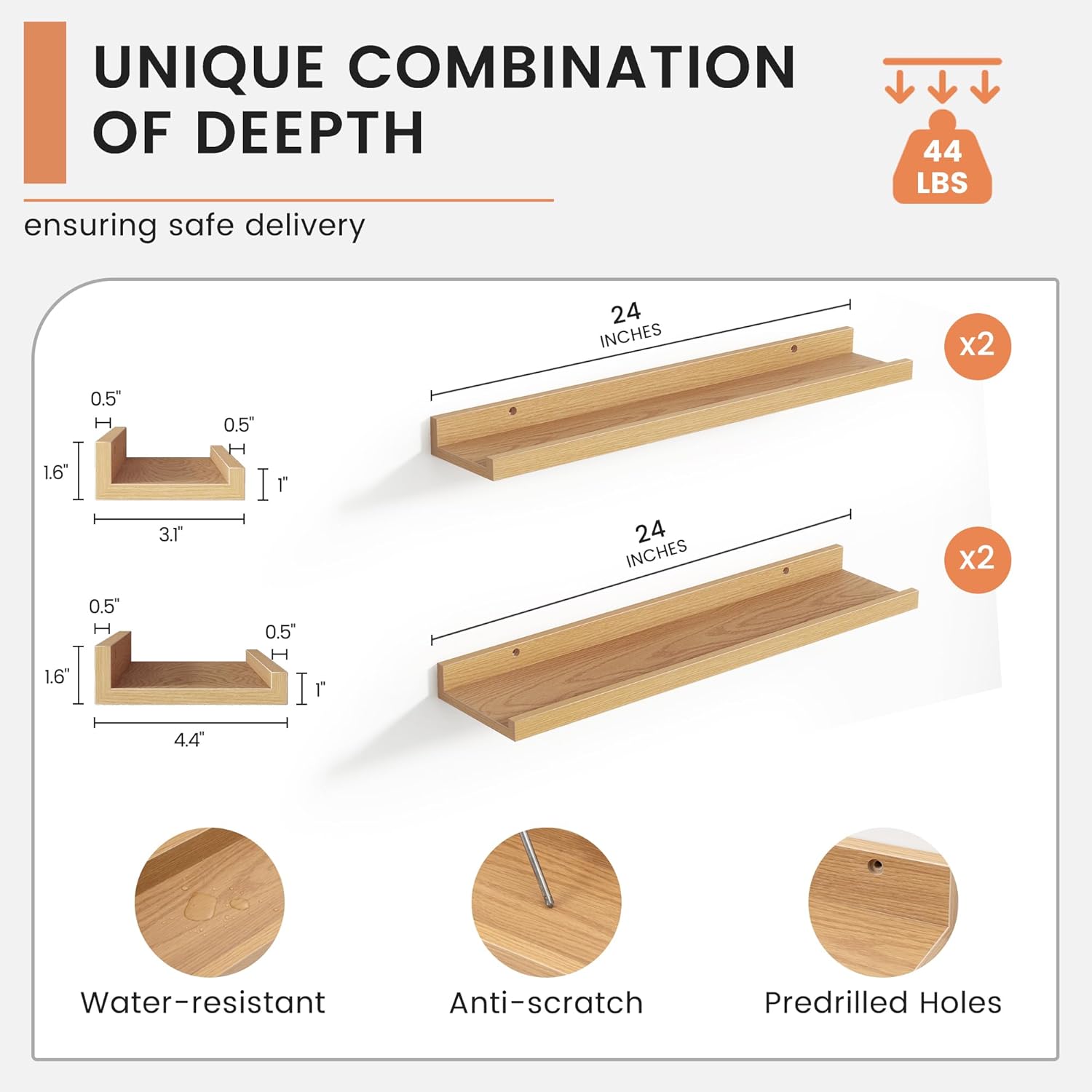 - 【Built to Last】Each floating wood shelves is made of high-quality wood, each shelf is designed for exceptional durability. The mounting holes are spaced 16 inches apart for secure wall stud installation, ensuring rock-solid support for your cherished items. Enjoy years of reliable use without sagging or warping
