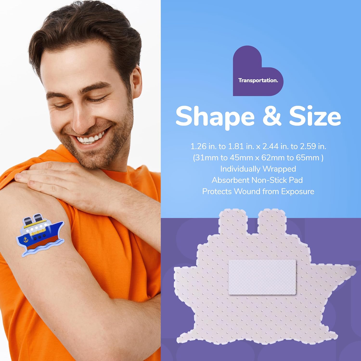 - TRANSPORTATION BANDAGES: This 50 piece pack of adorable vehicle shaped bandages is great for putting a smile on kids' faces while protecting wounds such as cuts, scrapes, and burns and comes in an assortment of boat, airplane, train, and helicopter shapes; sticky bandages are perfect for kids and adults alike, and also for school nurses and pediatric doctors