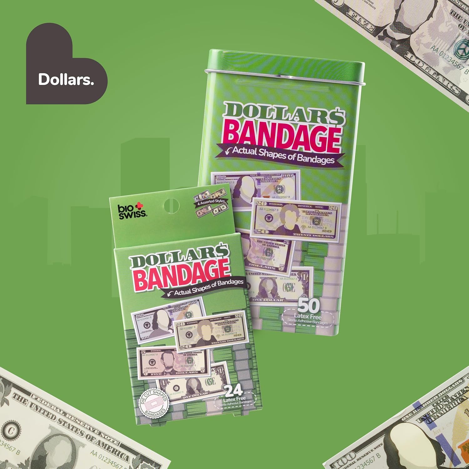 BioSwiss Bandages, Money Shaped Self Adhesive Bandage, Latex Free Sterile Wound Care, Fun First Aid Kit Supplies for Kids, 24 Count