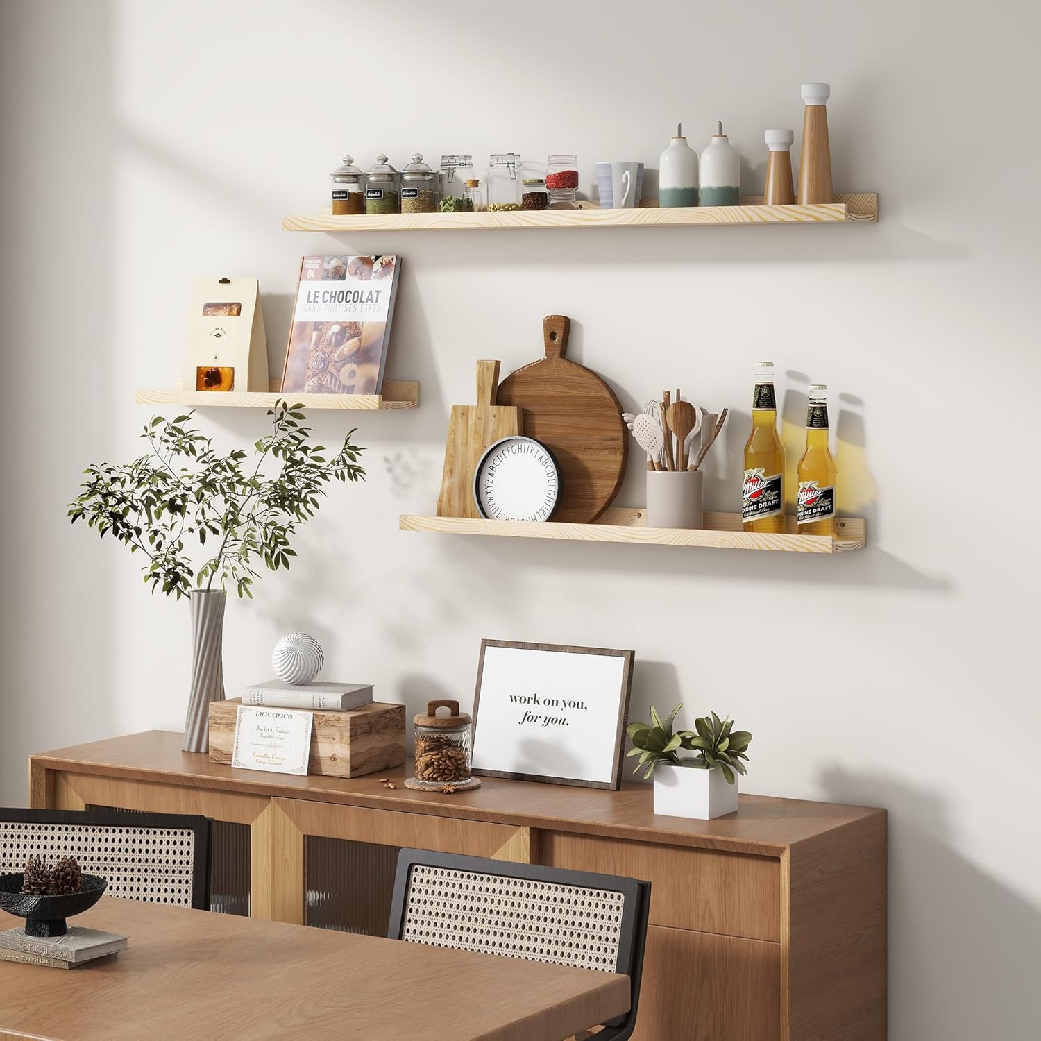 Picture Ledge Shelf for Wall, 24 inches Solid Pine Wood Nursery Book Shelves 3 Packs, Floating Ledge Shelves for Kids' Room Bedroom Bathroom Living Room Photo Frames Office Nursey Wall Decor, Natural