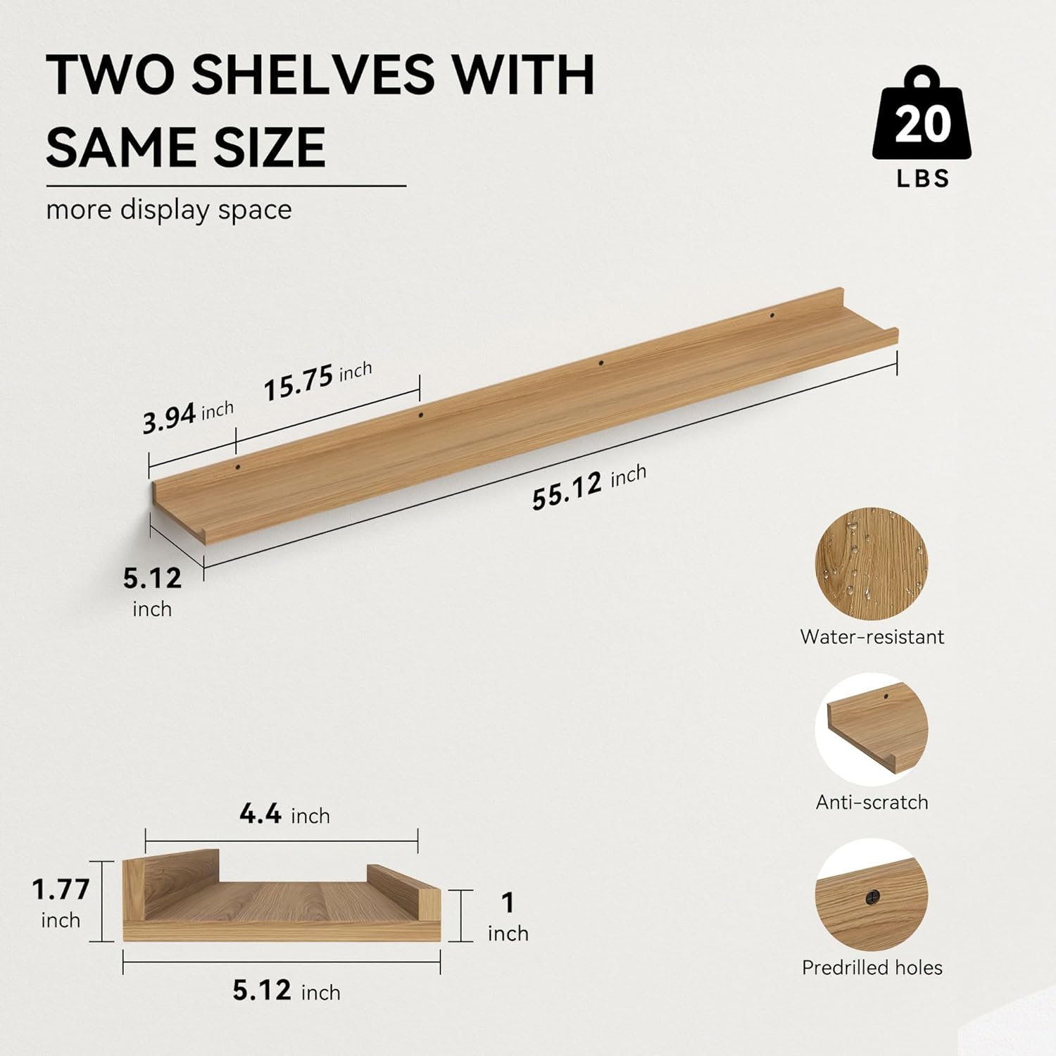 55.1 Inches Long Floating Shelves, 2 Set Rustic Wall Shelf for Bedroom, Nursery Book Shelf with Lip, Picture Ledge Shelf for Living Room, Bathroom, Kitchen - Oak