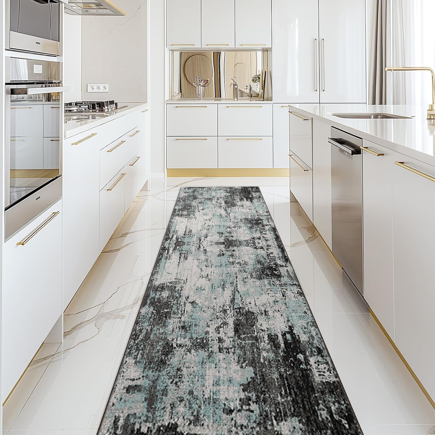 Washable Area Rugs 2'x10' Non-Slip Modern Abstract Soft for Living Room Entryway Bedroom Nursery, Print Pattern, Blue Black Teal