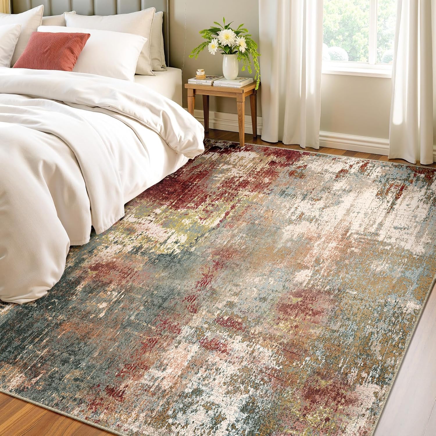 Washable Area Rugs 4'x6' Non-Slip Modern Abstract Soft for Living Room Entryway Bedroom Nursery, Print Pattern, Brown Rust Red Multi