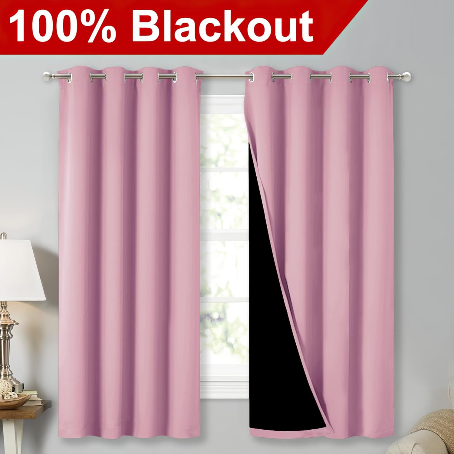 NICETOWN 100% Blackout Curtains with Black Liners, Thermal Insulated Full Blackout 2-Layer Lined Drapes, Energy Efficiency Window Draperies for Bedroom (Crystal Pink, 2 Panels, 52-inch W by 63-inch L)