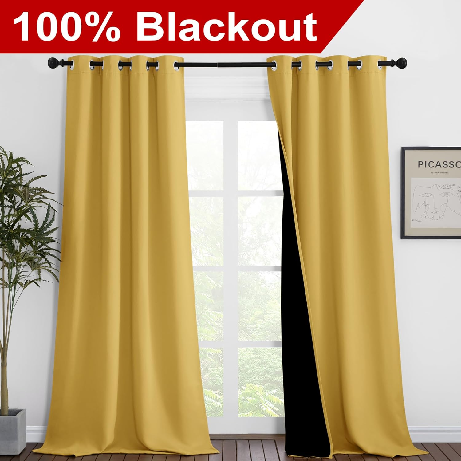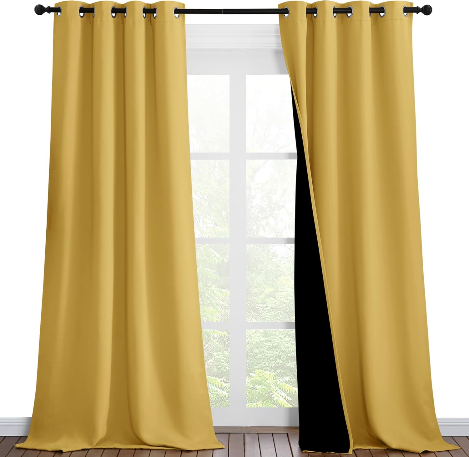 NICETOWN 100% Blackout Blinds, Set of 2, 46 inches x 96 inches, Laundry Room Decor Window Treatment Curtains for Large Patio Sliding Door, Thermal Insulated Bright Yellow Curtains for Bedroom