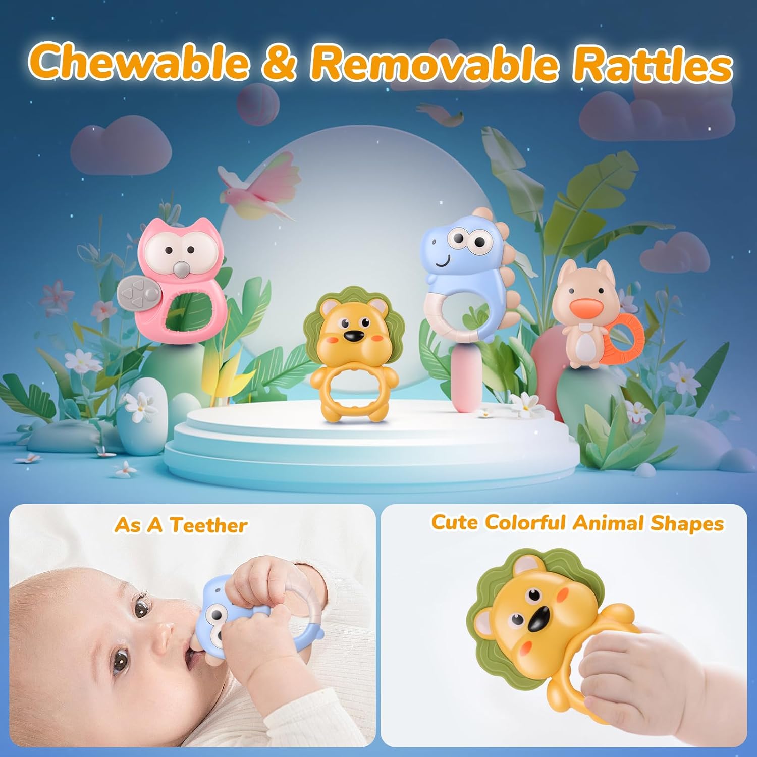 - 【Cute Rattles】Equipped with five colorful rattles, including lions, dinosaurs, owls, foxes, cute balls, etc., they not only dance joyfully under the drive of rotation, but can also be disassembled for easy cleaning, gnawing and biting, and used as baby teethers. This multifunctional baby mobile is beneficial for exercising children's hand eye coordination, soothing emotions, reducing crying, and is a companion for the healthy growth of newborns and infants aged 0-6 months, 6-12 months, or 12-24 months.