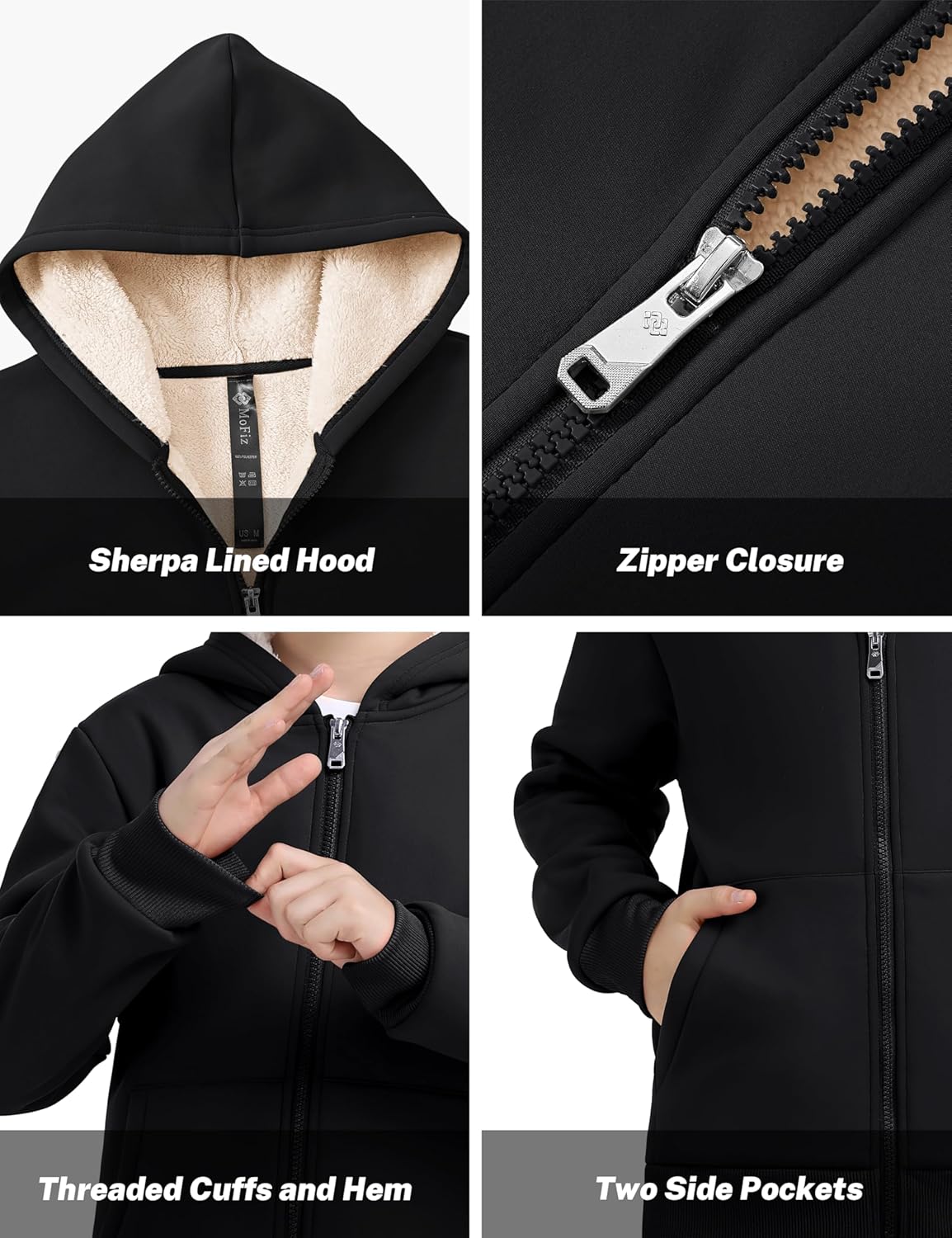 - 【Warm & Comfy】MoFiz Boys Girls Fleece Jacket is made of 100%Polyester, soft and durable outer shell and faux sherpa lined for softness and comfort. No pilling, no shedding, whether for daily wear or outdoor activities in cold weather, our sherpa lined zip up hoodie will keep your kids warm and cosy
