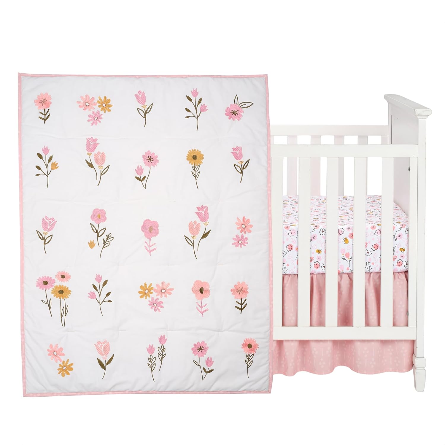 - 3 piece baby bedding set includes one quilt, one 100% cotton fitted crib sheet, and one decorative crib skirt