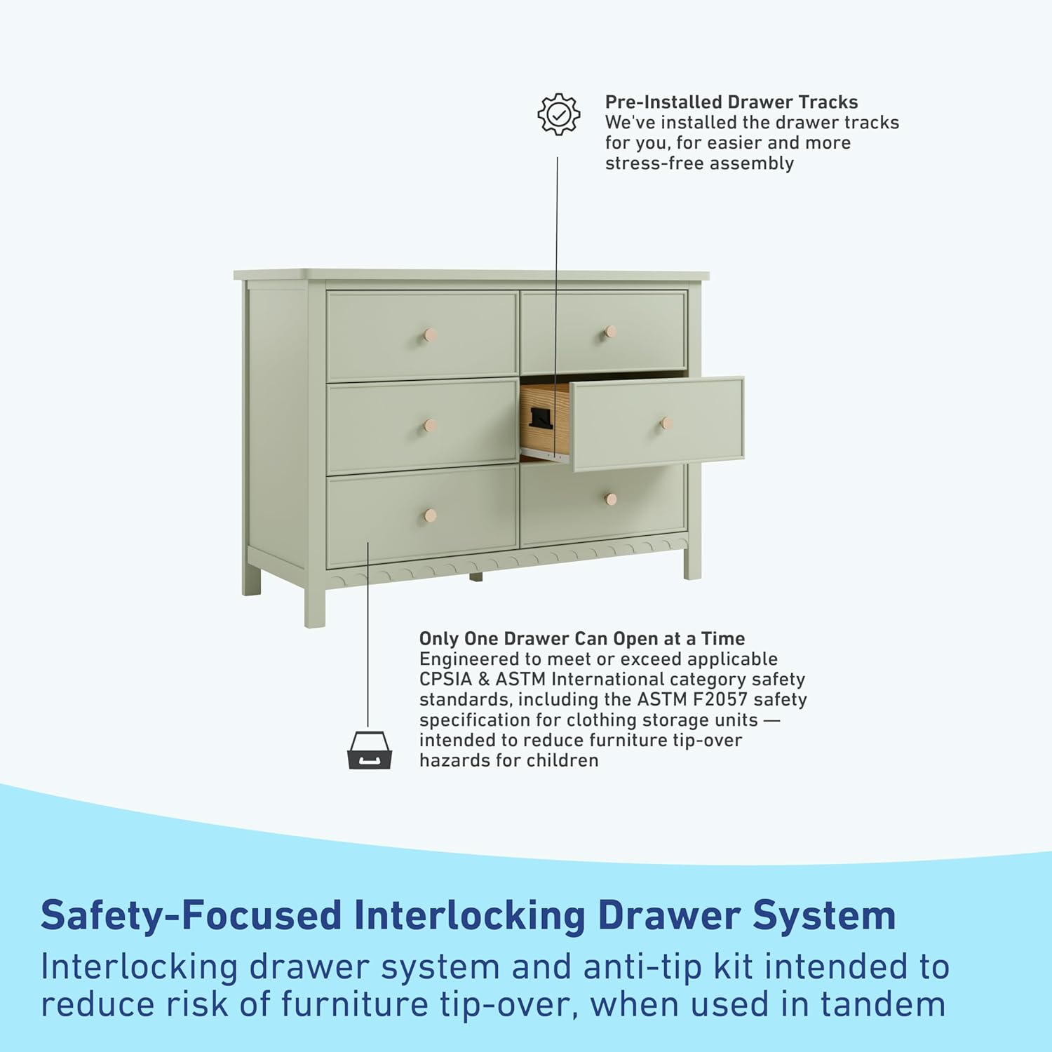 Graco Sasha 6 Drawer Dresser (Sage) – GREENGUARD Gold Certified, Wood Storage for Nursery or Kids’ Room, Safe Interlocking Drawer System & Easy Assembly with Pre-Installed Tracks