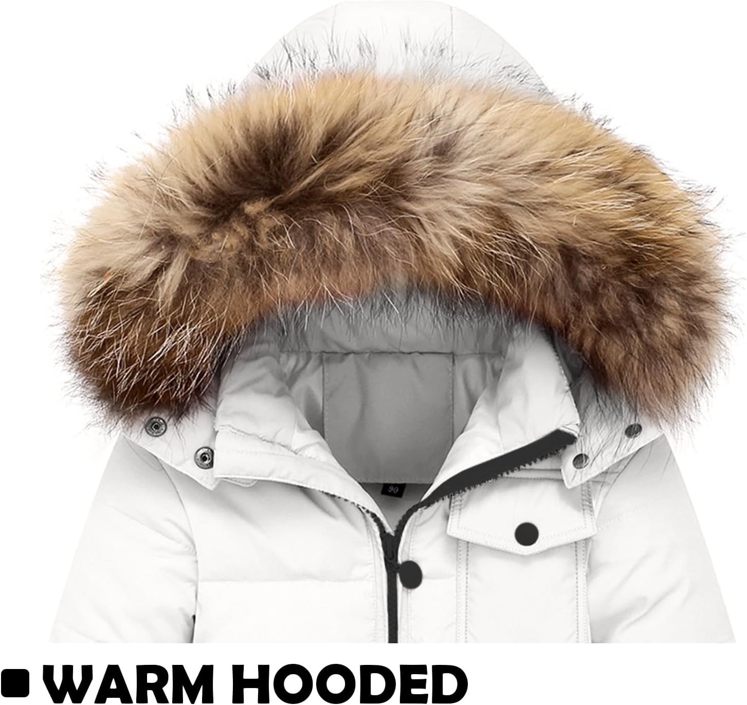 - Excellent design: Baby snowsuit snow pants jacket use classic ski wear design, cute big hood and fur collar can provide continuous warmth for baby's ears and head, adjustable suspenders with warm pants legs to allow baby to better activity.