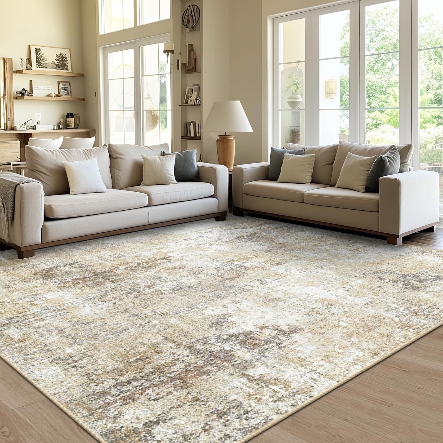 Washable Area Rugs 9'x12' Non-Slip Modern Abstract Soft for Living Room Entryway Bedroom Nursery, Print Pattern, Neutral Brown Gray