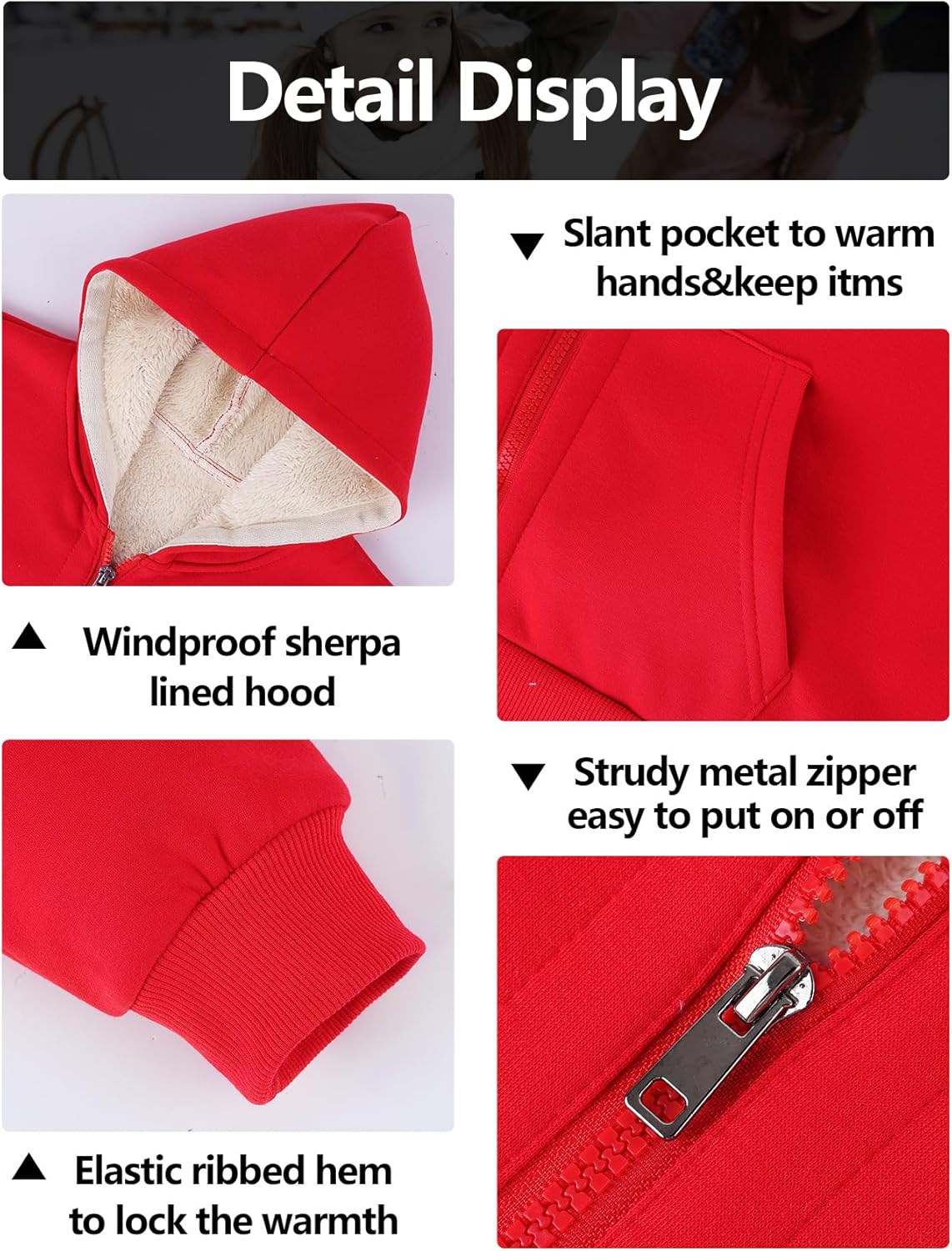 • Comfortable & Warmth:The unisex sherpa fleece lined jacket is made of high quality fabric, faux sherpa lined for softness and durability. The thick sherpa fleece lining kids zip up hoodie is cozy and warm, perfect for outdoor activities in cold weather.