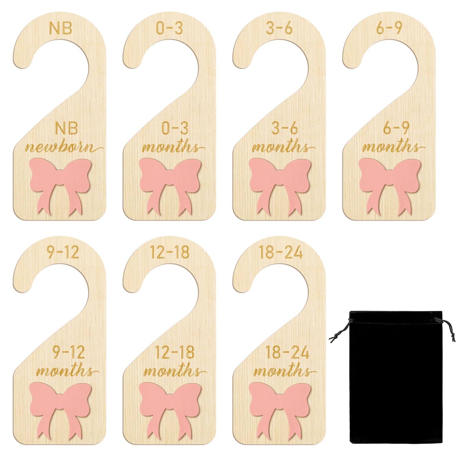- Pink Bow Baby Closet Dividers: Package includes 7Pcs clothing dividers covering all ages from newborn to toddler, Newborn, 0-3 months, 3-6 months, 6-9 months, 9-12 months, 12-18 months, 18-24 months, and 1 black velvet bag. Excellent choice for organizing clothes for parents-to-be.
