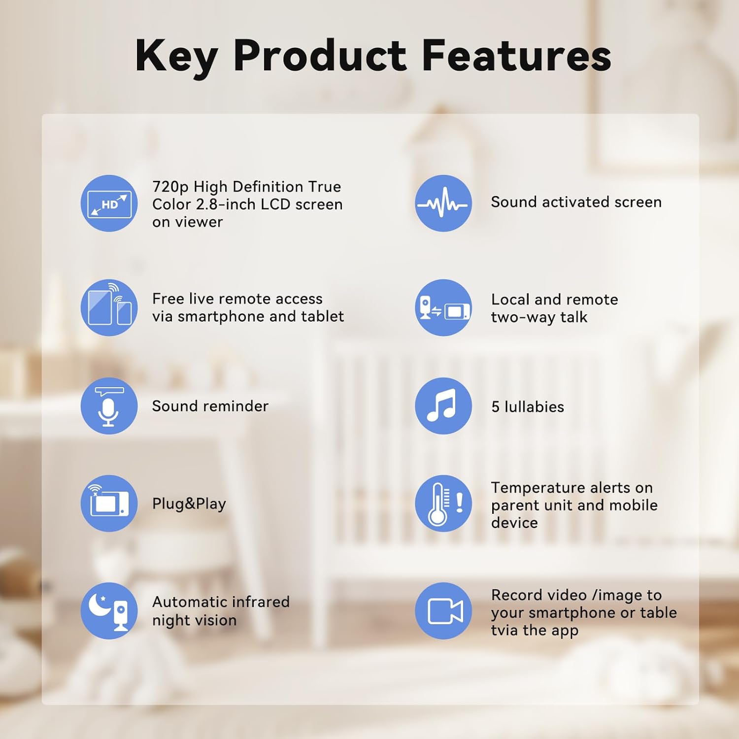 - 【Crystal Clear Audio and Video】: It's a Baby Monitor With Camera and Audio, Which Delivers Real-time Video And Clear Audio of Your Baby. With Exceptional Image Quality, You Can See Every Detail And Hear Every sound, Ensuring You Never Miss a Moment of Your Little One.