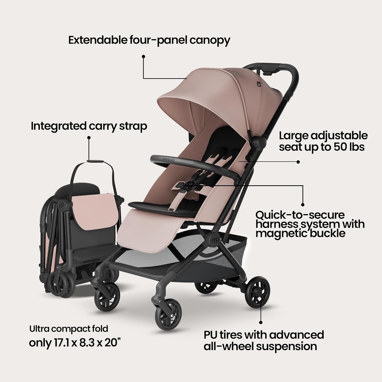 Mompush Velo Lightweight Travel Stroller – One-Hand Fold, Ultra-Compact & Airplane Friendly, Lie-Flat Recline Seat (from Birth to 50 lbs), Includes Cup Holder, Shoulder Strap, and Leather Bumper Bar