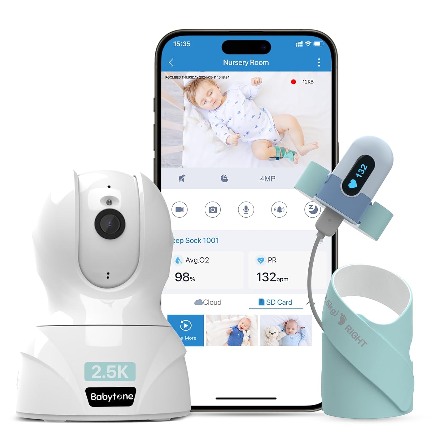 Babytone Baby Monitor - Smart Sleep Sock & 2.5K HD Camera, Track Heart Rate & Average Oxygen Level, Cry/Motion Detect, Two-Way Audio and Night Vision Baby Monitor with APP