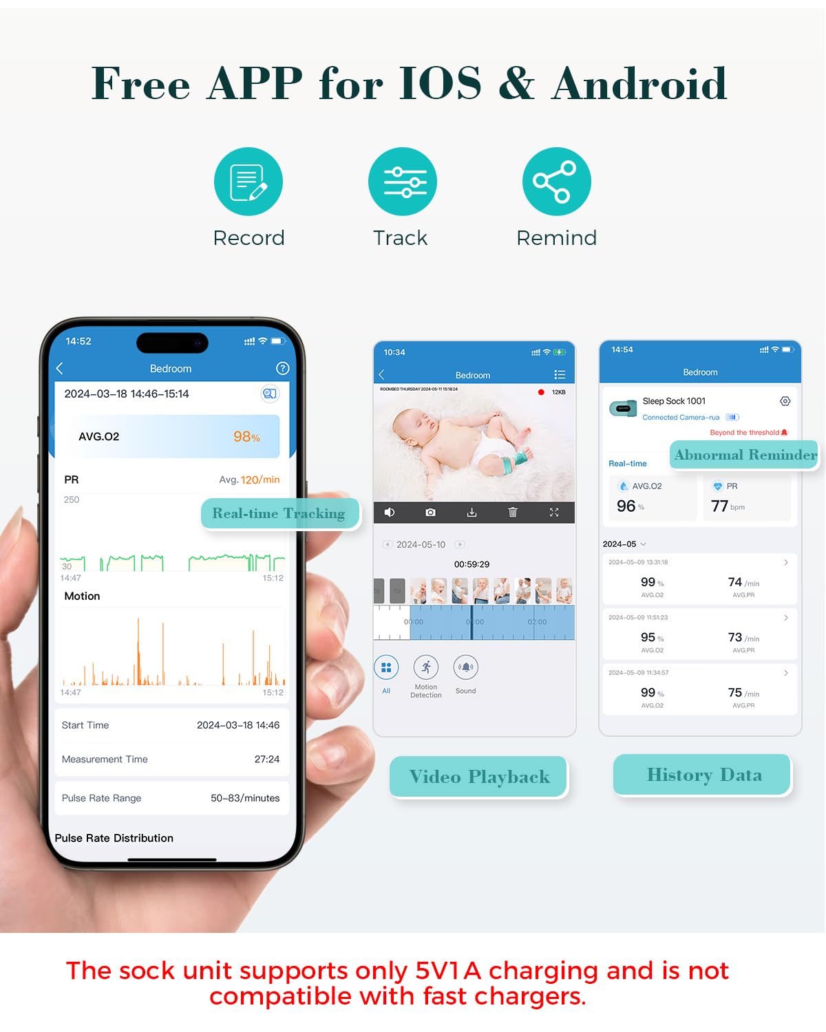 - 【Peace of Mind Day and Night】 Keep a close eye on your baby's sleep with smart sleep sock and 2.5K HD camera. Track heart rate and average oxygen level overnight, capturing details with the clear night vision camera
