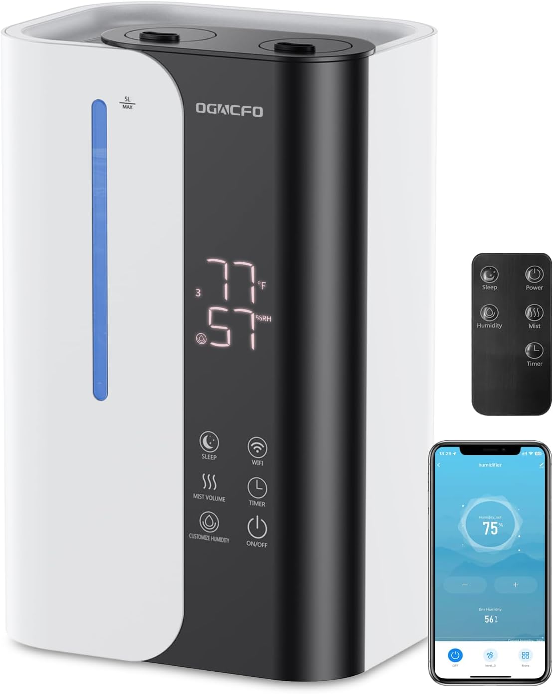 - 𝐒𝐦𝐚𝐫𝐭 𝐂𝐨𝐧𝐭𝐫𝐨𝐥 𝐰𝐢𝐭𝐡 𝐓𝐮𝐲𝐚 𝐀𝐩𝐩: Connect this large humidifiers for home to Wi-Fi and control it remotely through the Tuya app. Turn it on/off, adjust humidity levels, modify mist output, set a 24-hour countdown, and more, all from your phone