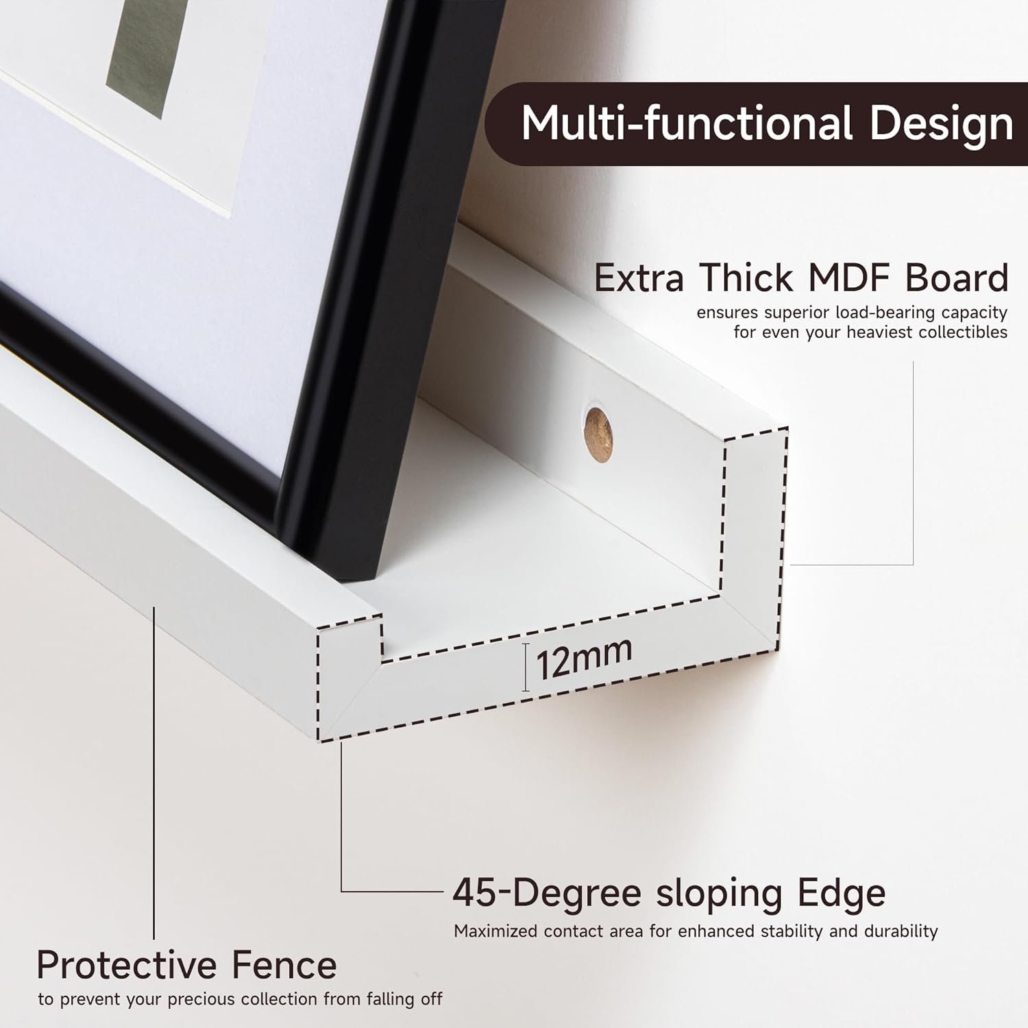 - 3.5" PICTURE LEDGE DESIGN: Ideal for displaying photos, artwork, or collectibles, these feature a thoughtful extremely narrow 3.5-inch width ledge design to prevent items from sliding forward, its mounting holes are spaced 16 inches apart for secure mounting to wall studs uncluttered aesthetic