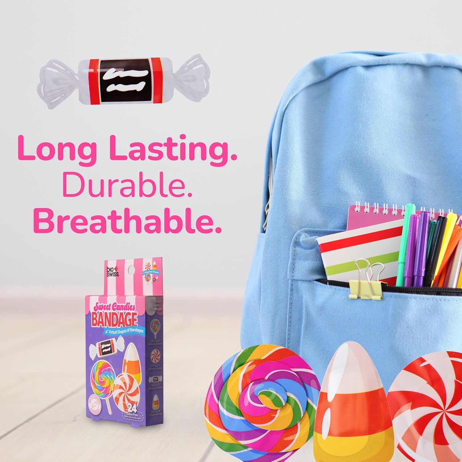 BioSwiss Bandages, Sweet Candies Shaped Self Adhesive Bandage, Latex Free Sterile Wound Care, Fun First Aid Kit Supplies for Kids and Adults, 24 Count