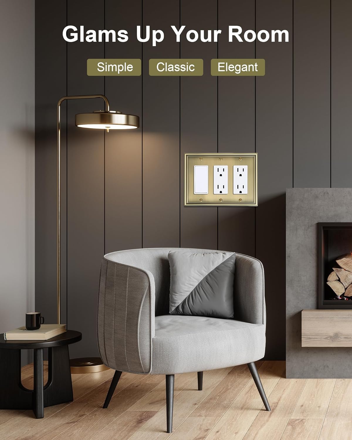 - Wide Application - Versatile and easy to match, These brass wall plates are compatible with Decorator Outlet Receptacle, Roker Switch, Dimmer Switch, GFCI Outlets. Complements any interior style, whether your decor is modern, traditional, or contemporary, this decorative switch plate cover seamlessly blends in and glams up your wall.