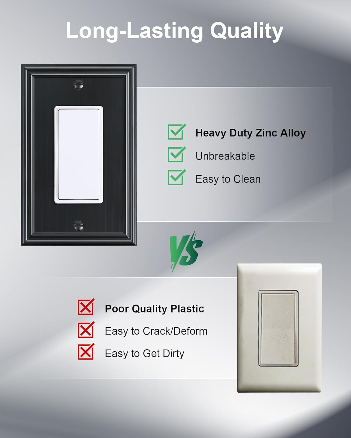 - Durable Solid Zinc Alloy - Constructed from thick and sturdy zinc alloy, the wall plate cover offers exceptional durability and sturdiness, easier to clean and maintain. It is resistant to high impact, tarnishing, and corrosion, unbreakable. Ensuring it remains a stunning addition to your home for years to come.