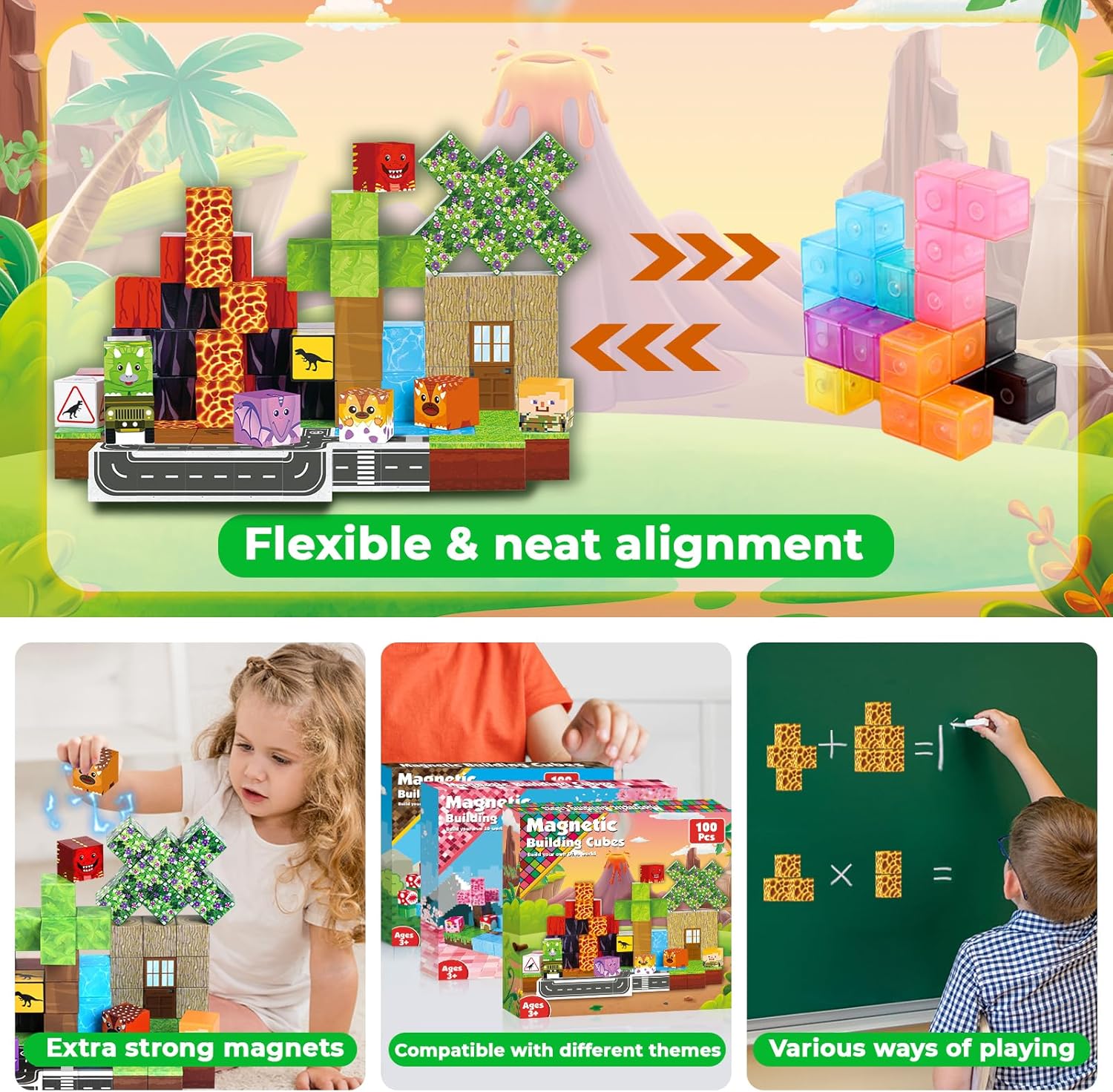 Goody King Dinosaur Volcano Magnetic Block World |100PCS Dinosaur Magnetic Block Cubes,STEM Montessori Sensory Toys for Toddlers Kids Boys Girls Ages 3-5 6-8 Christmas Birthday Gifts