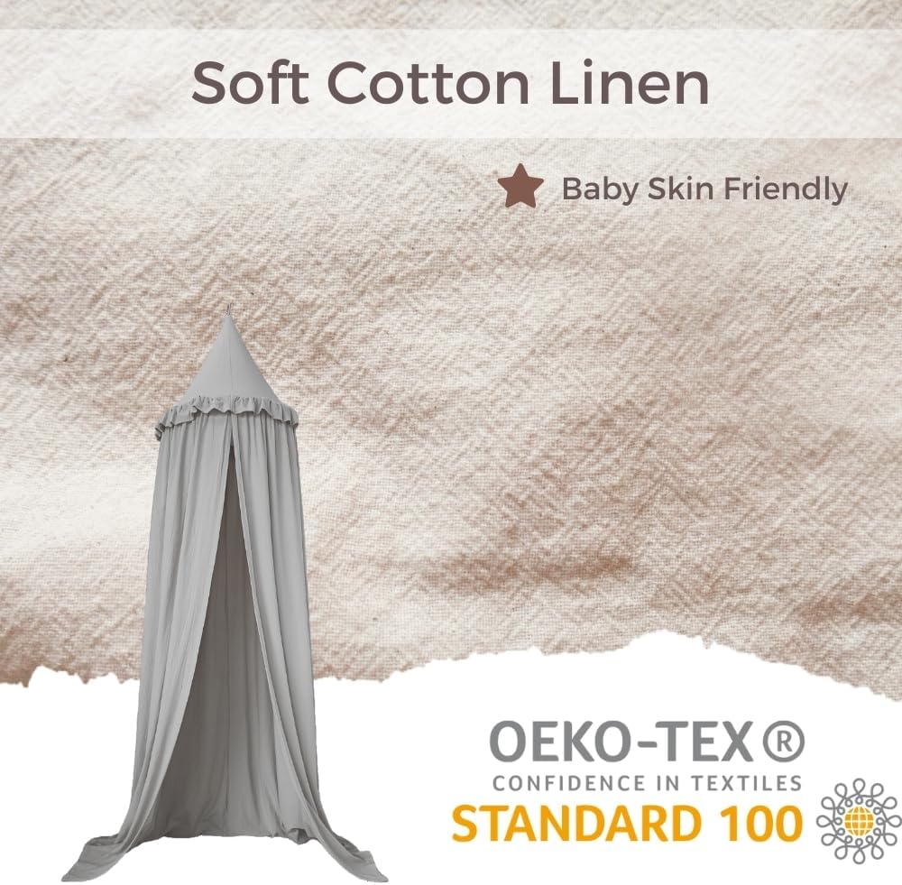 Wonder Space Kids Bed Canopy with Ruffles, Lace Frilled Cotton Tent Net, Pastel Neutral Colors for Boys & Girls, Nursery Room Baby Crib Hanging Curtain Mosquito Net Children Reading Nook Decor (Grey)