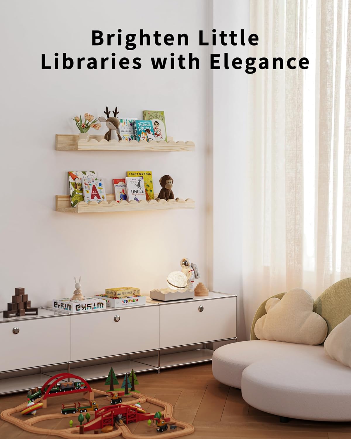Nursery Book Shelves, 4-Pack Wood Floating Shelves for Wall Kids, Scalloped Shelves, Wall Book Shelves for Bedroom Kids, Toddler Room, Baby Room, Nursery Decor(Wood, 16.5 Inches)