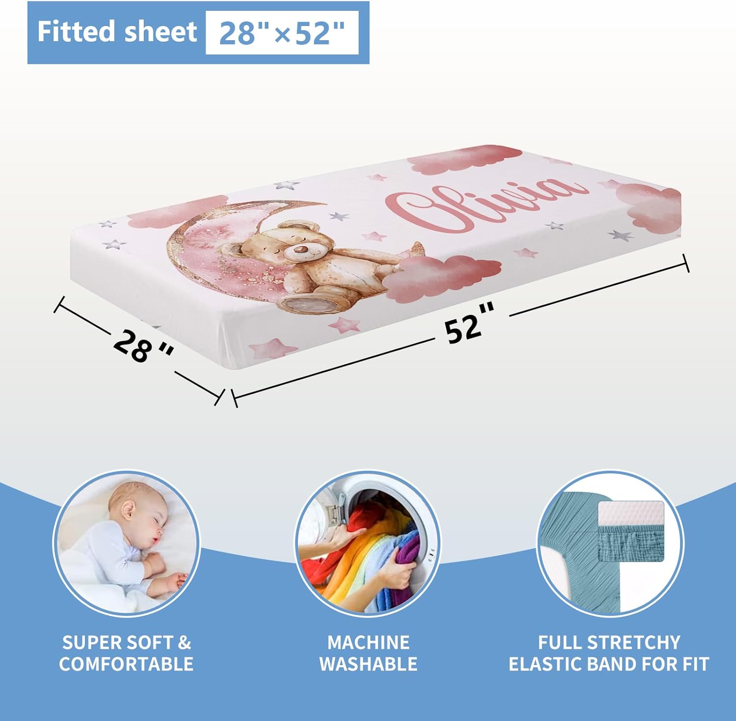 Custom Baby Crib Set, 5 Pcs Personalized Name Pink Bear Theme for Infants Toddlers, Nursery Bedding for Girls, Double Layer Customized Gifts