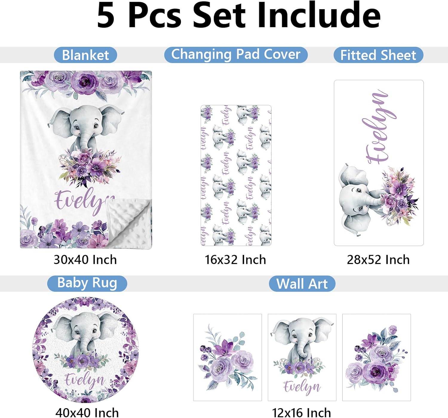 Personalized Baby Crib Bedding Set, 5 Pcs Custom Baby Bedding Set with Name, Double Layer Baby Elephant Crib Set for Girls, Soft Flannel Nursery Bedding Set, Toddlers Infants New Parents Gift