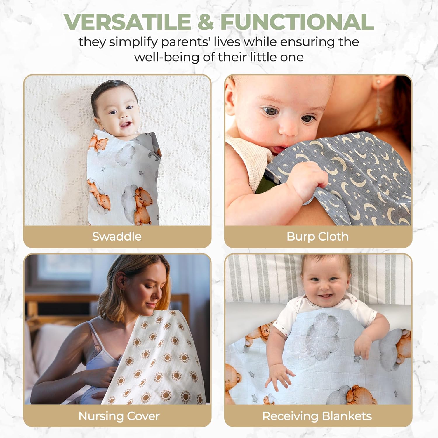 - PRACTICAL & MULTI-USE : Versatile and essential, these soft baby blankets can be used as receiving blankets for boys and girls, security blankets, stroller covers, crib sheets, play mats, changing pad covers, nursing covers, burp cloths, newborn photo props or hospital blankets. They also serve as snuggly comforters for sleep and everyday life. You can use them however you like. A thoughtful baby shower gift for a mom you care about.