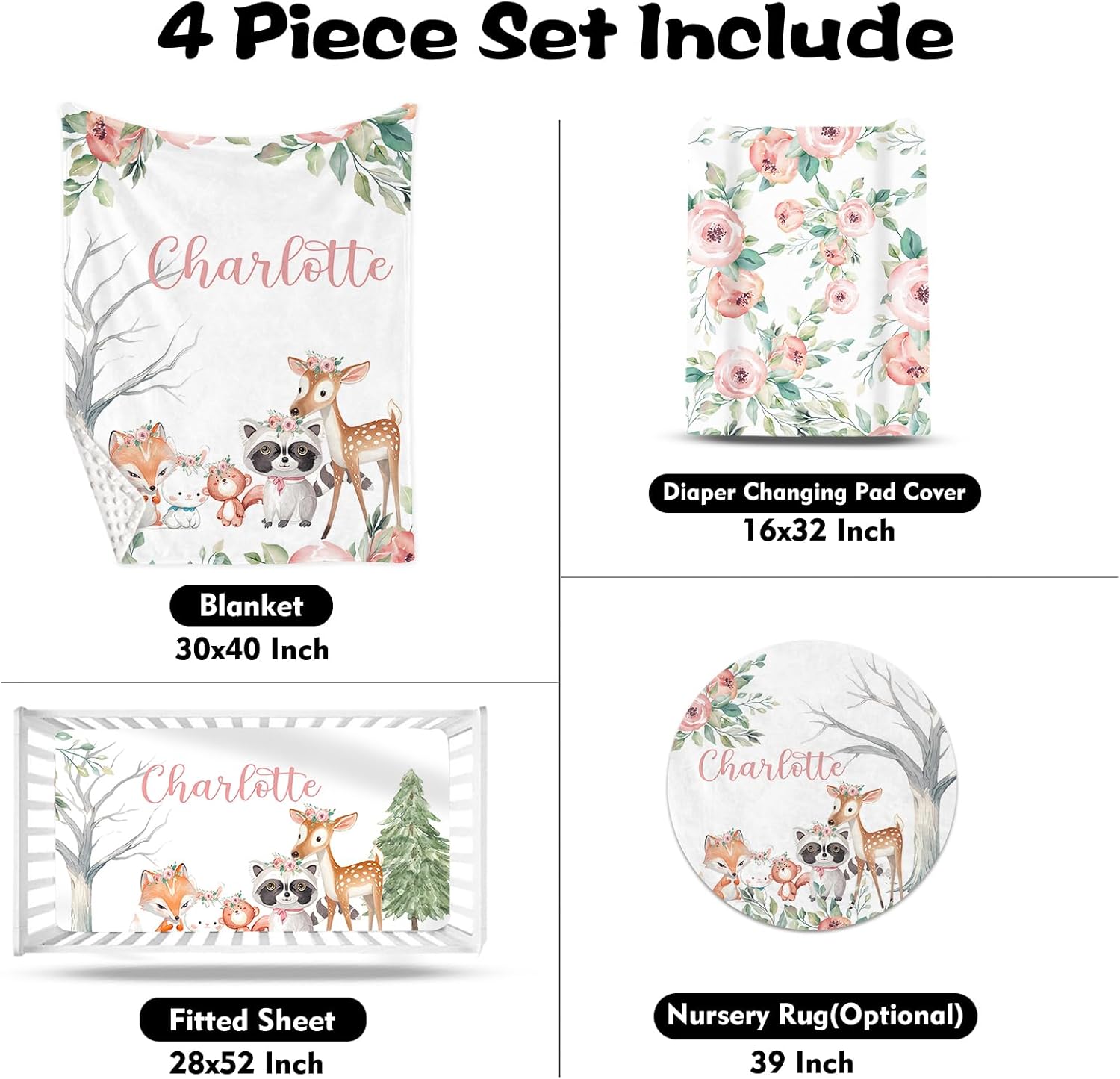- 【Custom Gift】This baby girl crib bedding set with custom name makes a perfect gift for baby showers or birthdays. Give your little one a dreamy and comfortable nursery with our animals theme baby crib bedding set and nursery rug.