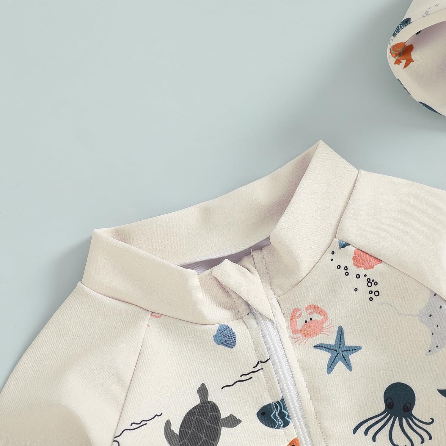 - Design: Toddler bathing suit boy, infant long sleeve swimsuit boy, round neck, back/front zipper closure for easy on and off, newborn swimsuit boy, dinosaur/marine animal print, super cute and lovely, your little boy will stand out in the crowd