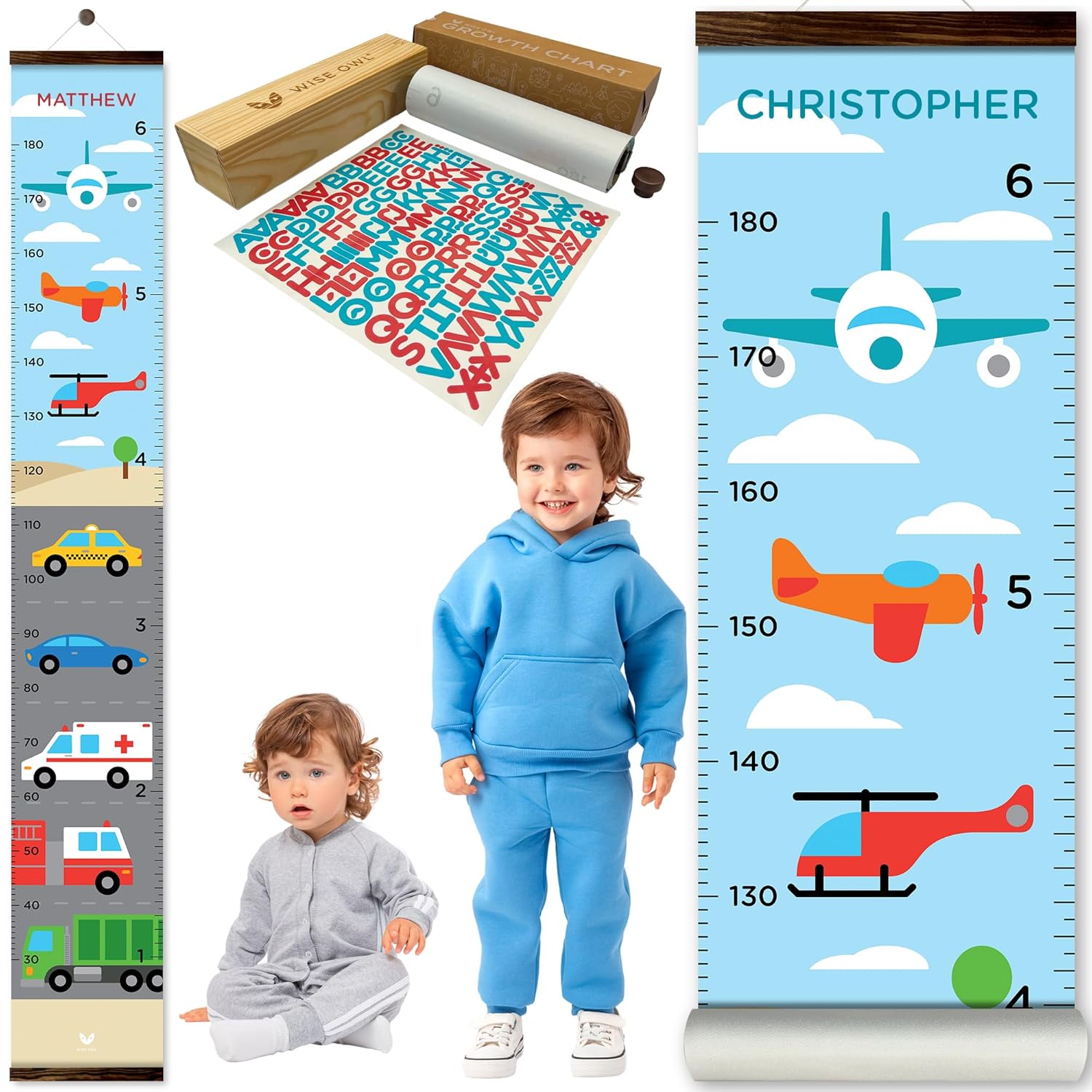 WISE OWL Personalized Growth Chart for Kids - Height Wall Chart for Boys with Peel & Stick Letters for Name - Hanging Canvas Wall Measurement Height Tracker for Baby Gift (Vehicles)
