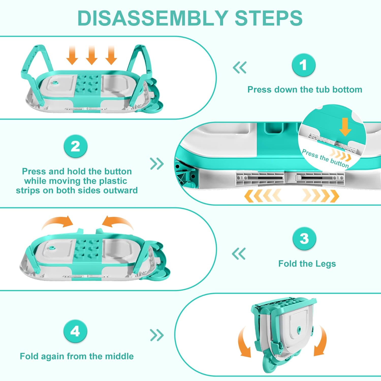 - Double-Fold Collapsible Design: TPN collapsible baby bathtub features an ingenious double-fold design, compactly measuring less than 4 inches in thickness. This facilitates effortless storage in any corner and enhances portability for on-the-go convenience, making it a perfect companion both at home and during travel. The off-the-floor drain with a user-friendly rubber plug guarantees seamless draining without the need for relocation.