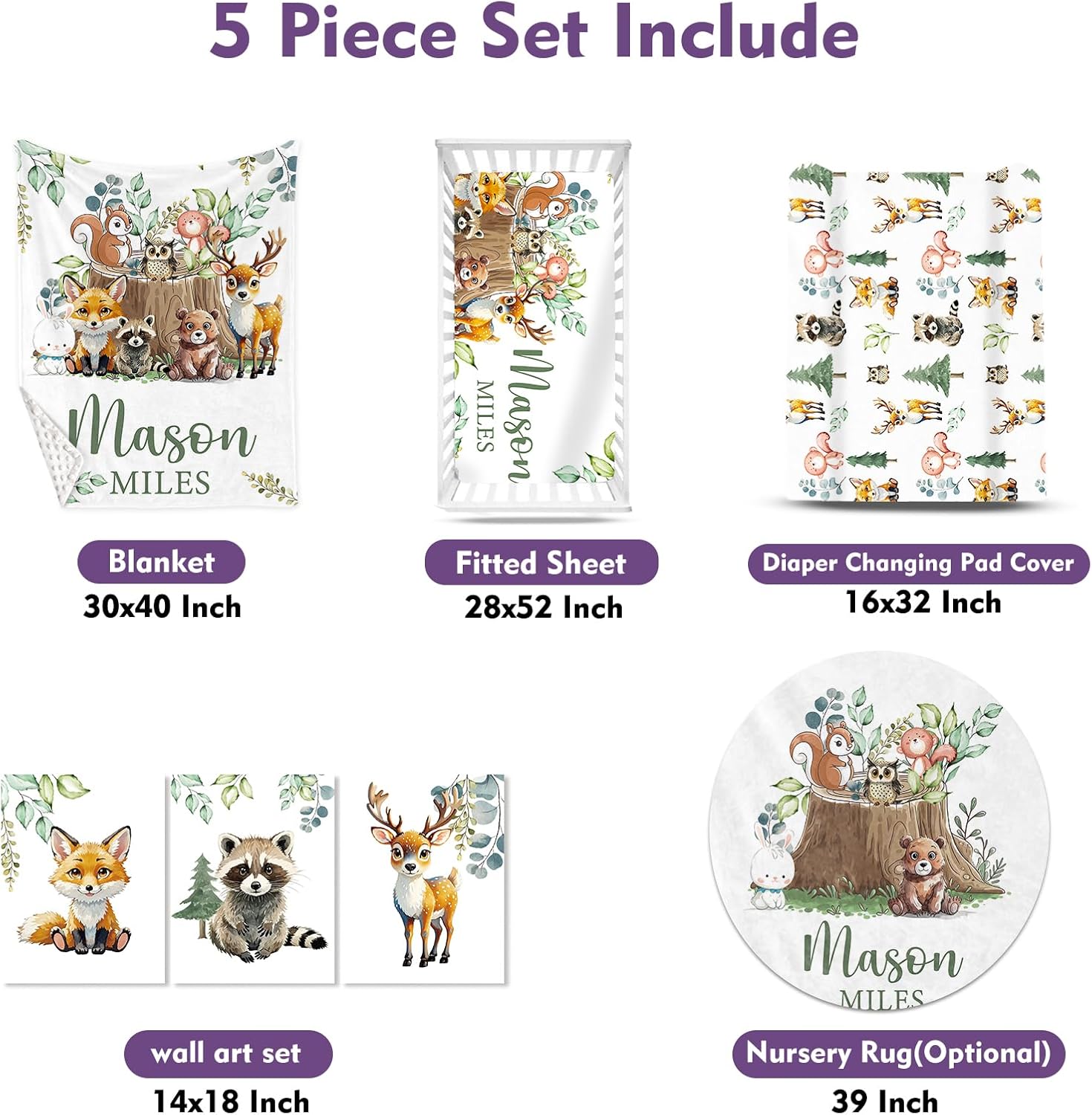 Personalized Baby Crib Bedding Set for Baby Boys Girls, Animal Stump Pattern Custom Name Baby Crib Sets 5-Pcs, Toddler Double Layer Blanket Fitted Sheets Changing Pad Cover Rug Wall Art Set