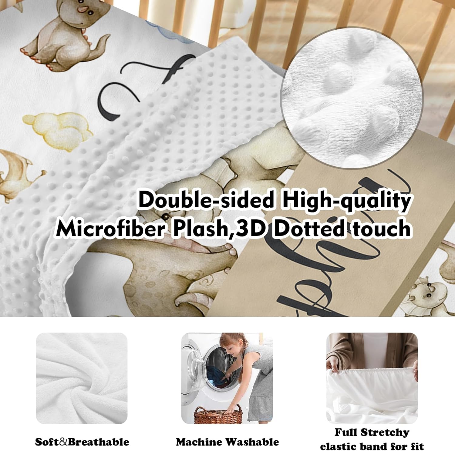 Personalized Baby Crib Bedding Set, 5-Piece Cute Dinosaur Baby Crib Sets with Custom Name, Toddler Double Layer Blanket Fitted Sheets Changing Pad Cover Rug Wall Art Set, Charming Nursery Decor