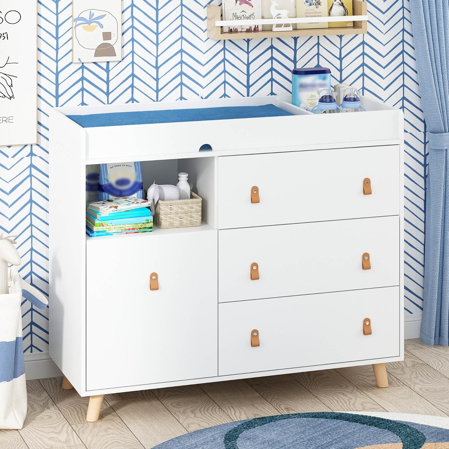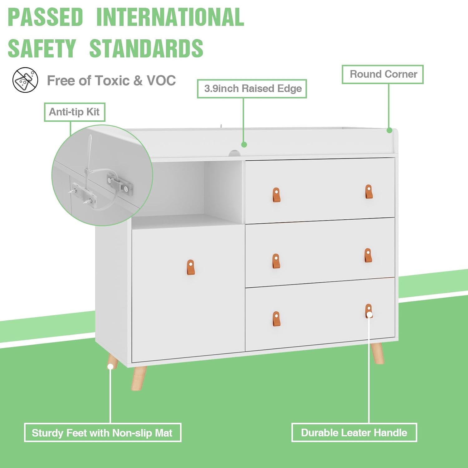 - Safety: Specially designed soft yet durable leather handles complement the sleek wooden cabinet, offering a safer alternative to traditional metal handles, making it a secure choice for infants, toddlers, and active children running around the house. The four raised safety railings surrounding the changing table provide a secure enclosure, allowing you to use a safety strap to ensure your baby stays safe on the tabletop during diaper changes.