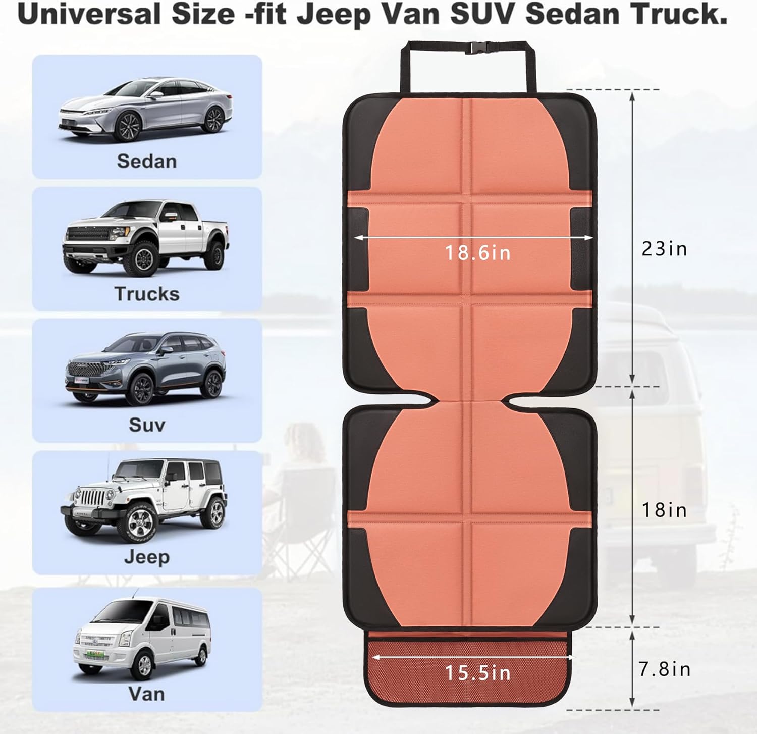 Car Seat Protector for Child, 2 Pack Covers with Mesh Pockets & Non-Slip Backing, 600D Durable Under Seat for Back (Orange, Large)