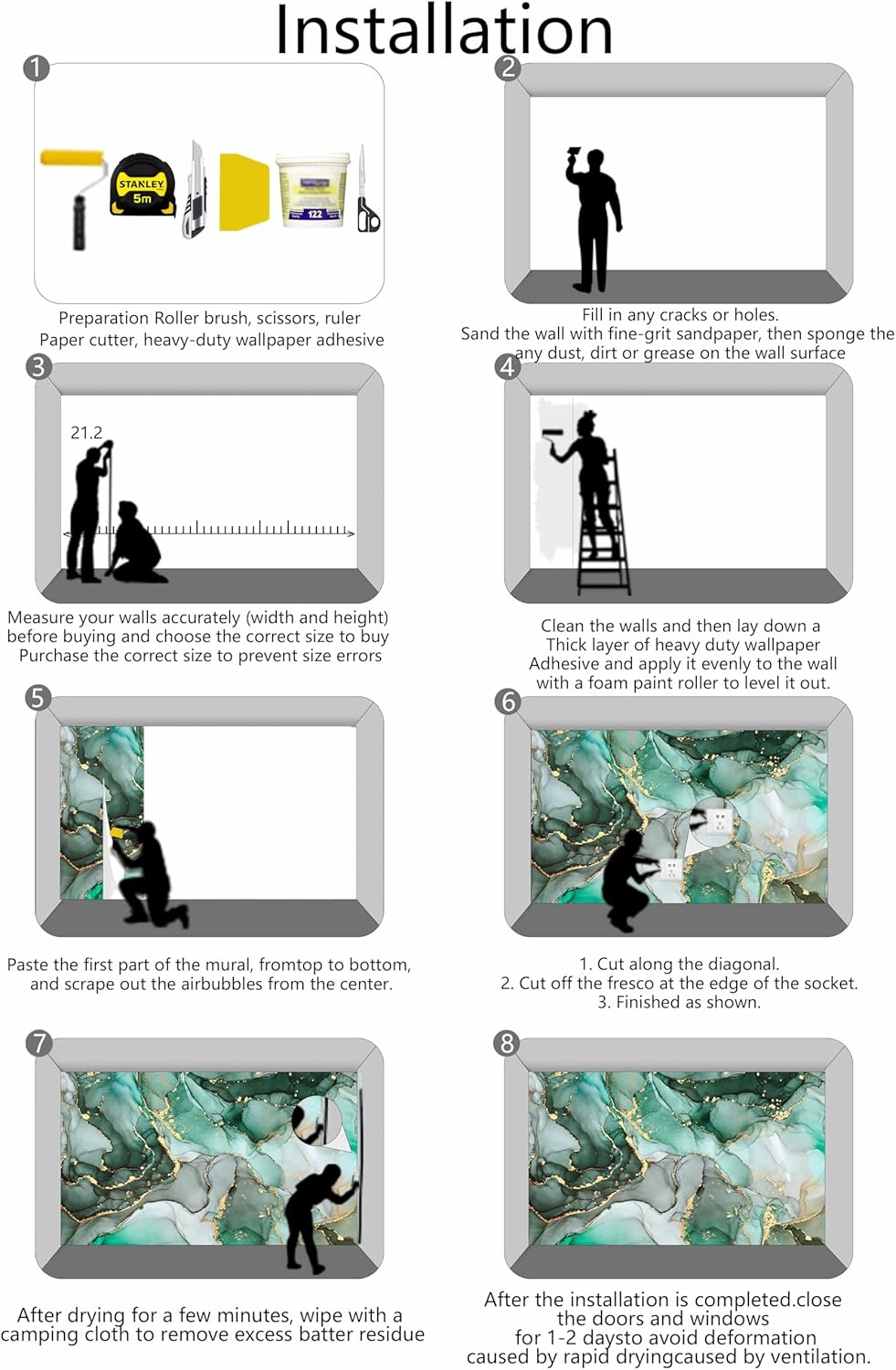 - Installation Steps1. Fill in any cracks or holes and clean the surface of the wall of dust, dirt and grease.2. Apply heavy-duty wallpaper paste to the wall, not the mural.3. Mark the position of each strip of wallpaper with a spirit level.4. Align the pattern and slide it into place.5. Scrape the bubbles with a spatula.6. Let it dry for a couple of minutes and it's ready to go!