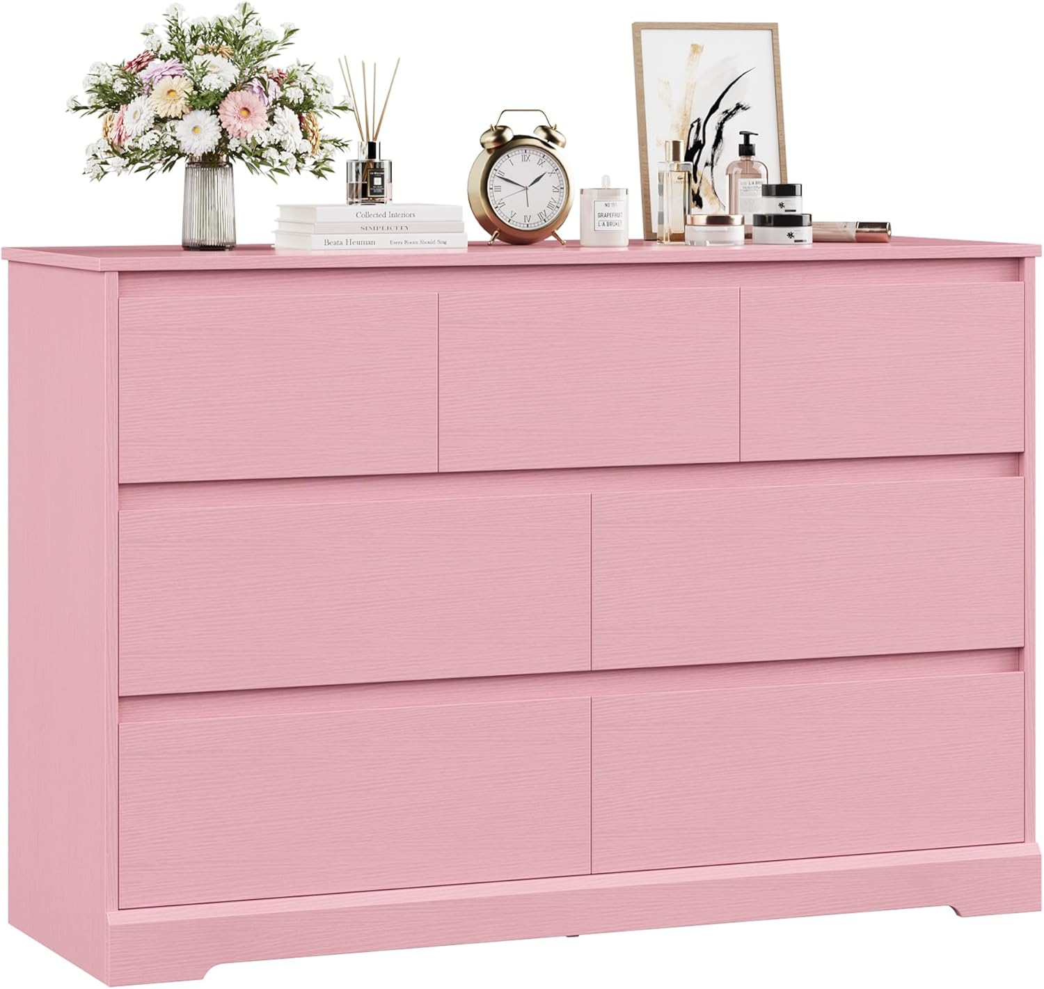 Dresser for Bedroom, Modern Pink Dresser, Wood Chest of Drawers Nursery Dressers, with Storage, 7 Drawer Double with Handle Free, Large Storage Organizer for Living Room,Pink