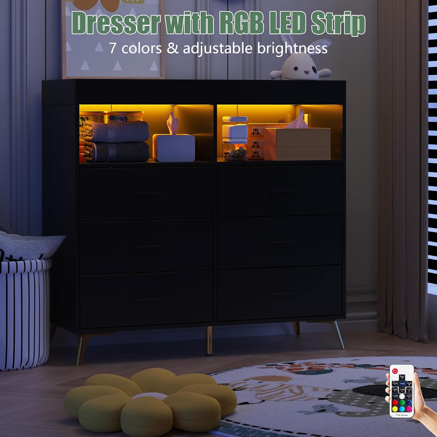 GarveeHome Dresser for Bedroom with 6 Drawers, Baby Changing Table Dresser with Changing Pad, LED Lights & Charging Station, Baby Changing Station with Changing Table Top, Black