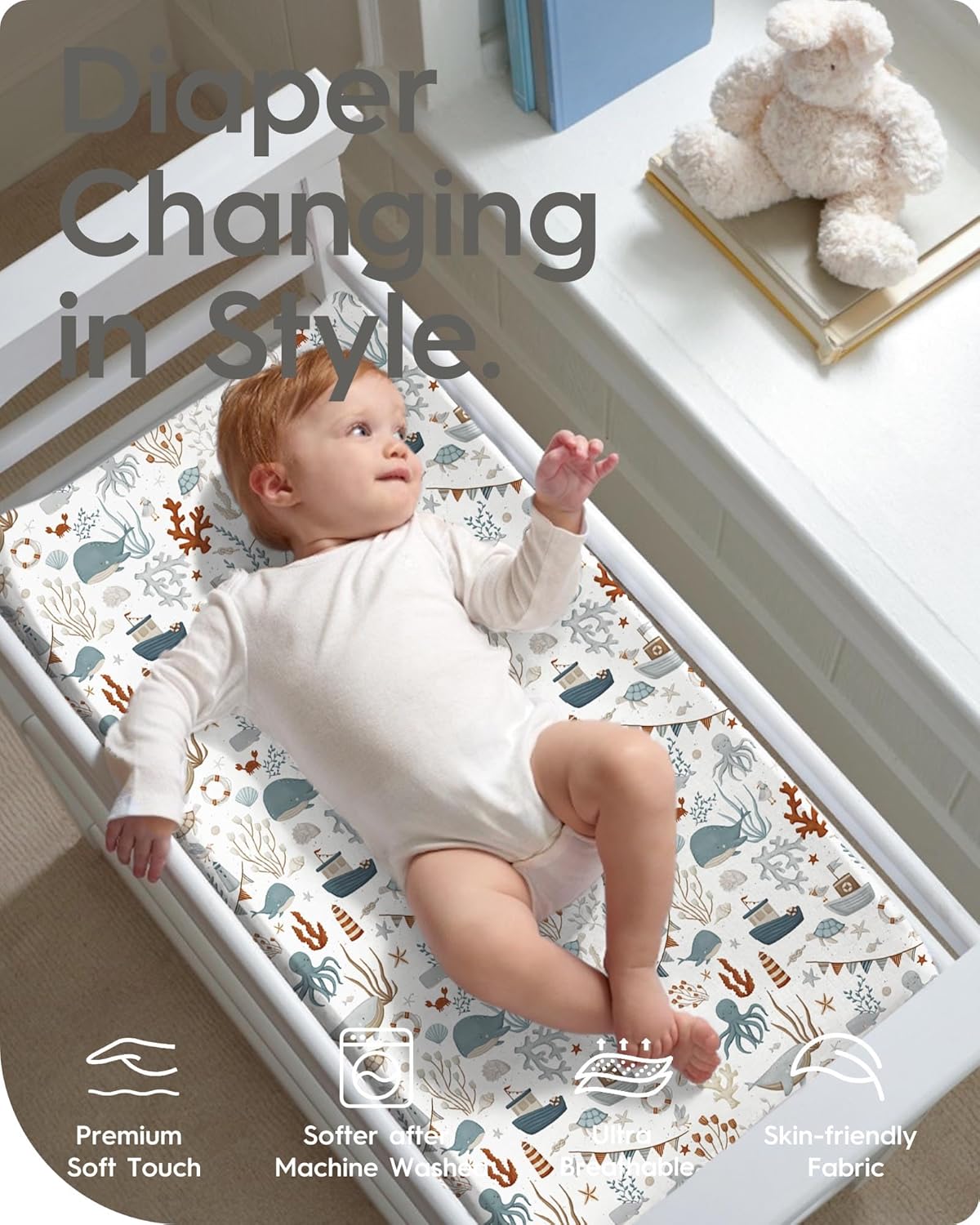 - ULTRA-SOFT AND HIGH QUALITY: Our changing table cover are made with 100% high-quality rayon knit cotton, making them ultra-soft, hypoallergenic, and breathable. This creates a safe and comfortable sleeping environment for your little one, helping them sleep longer and more peacefully.