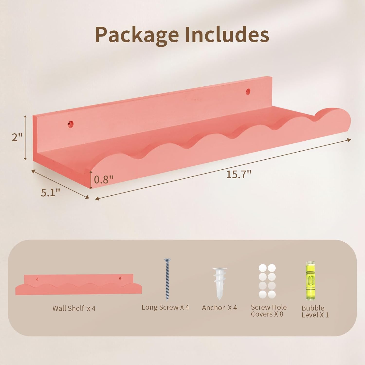 - Easy to Install - The Bookshelf for Nursery Comes with Detailed Installation Instructions to Ensure Easy and Quick Installation. The Package Includes 4 Bookshelves, Self-Adhesive ScrevHole Covers x8, Screws (8mm x 40mm)X8, Heavy Duty Drywall Anchors (14.5mm x32mm)x8, and Leveling toolx1.