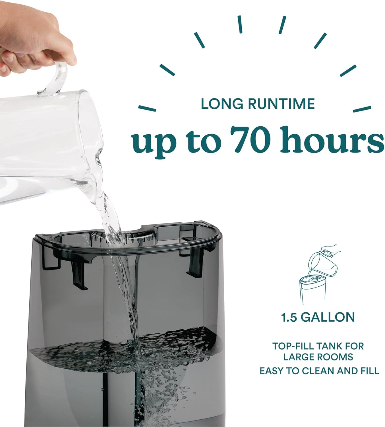 - Top-Fill Tank: Easy to fill and clean; 1.5-gallon water tank provides up to 70 hours of runtime based on mist setting; Clean Tank Technology helps protect the tank from mold and mildew; automatically shuts off when out of water; ideal for large family rooms and bedrooms up to 502 sq. ft