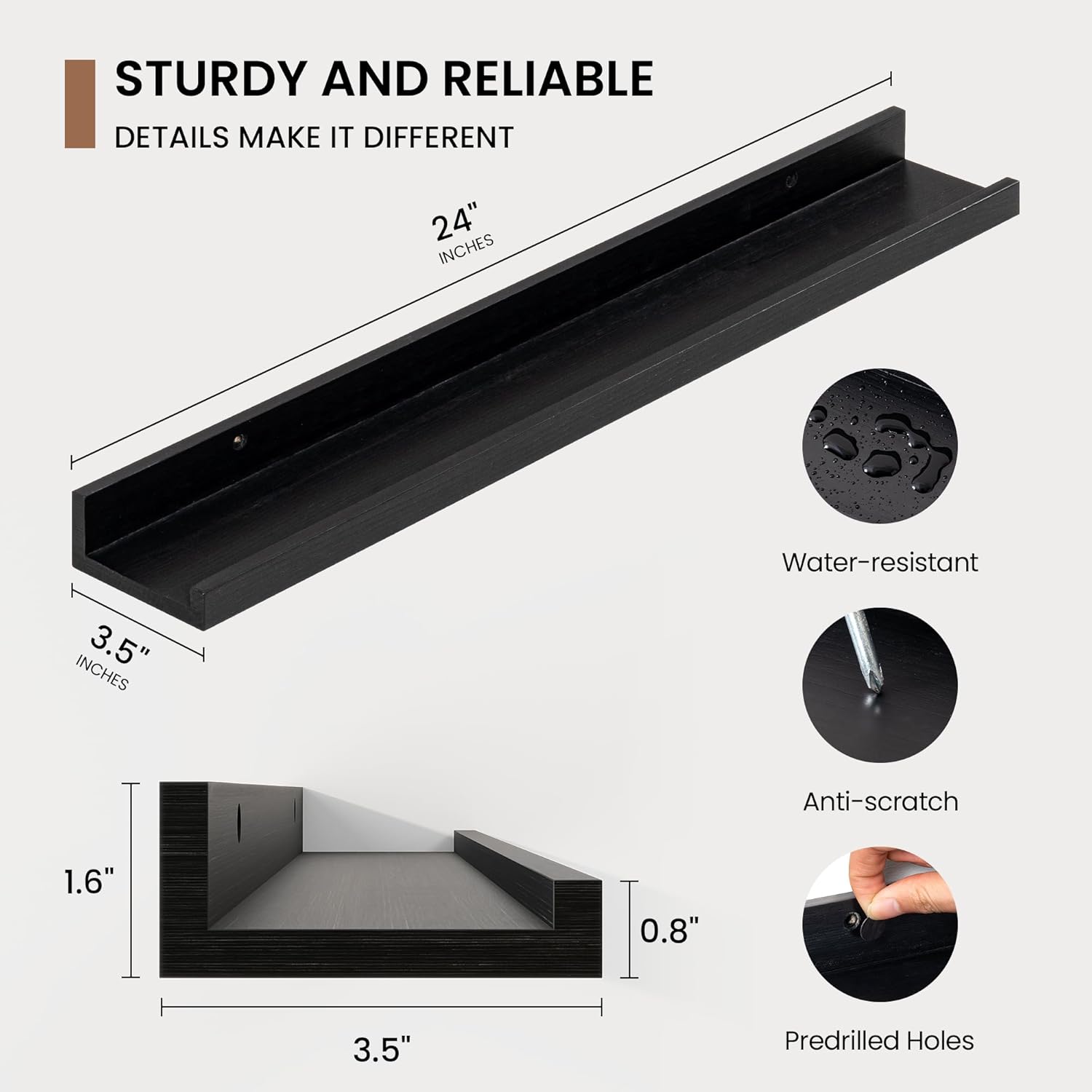 Picture Ledge Shelf, Solid Pine Wood Floating Shelves Set of 2, 24 Inches Nursery Book Shelves for Toys Storage, Kids Bookshelf Wall Mounted for Living Room Bedroom Decor Books Photo Frames, Black