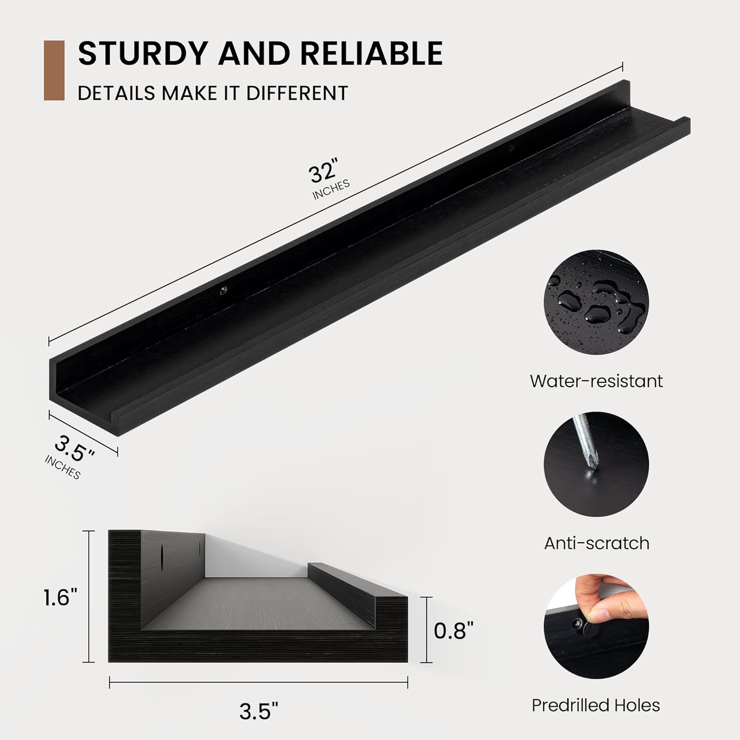 Picture Ledge Shelf, Solid Pine Wood Floating Shelves Set of 2, 32 Inches Nursery Book Shelves for Toys Storage, Kids Bookshelf Wall Mounted for Living Room Bedroom Decor Books Photo Frames, Black