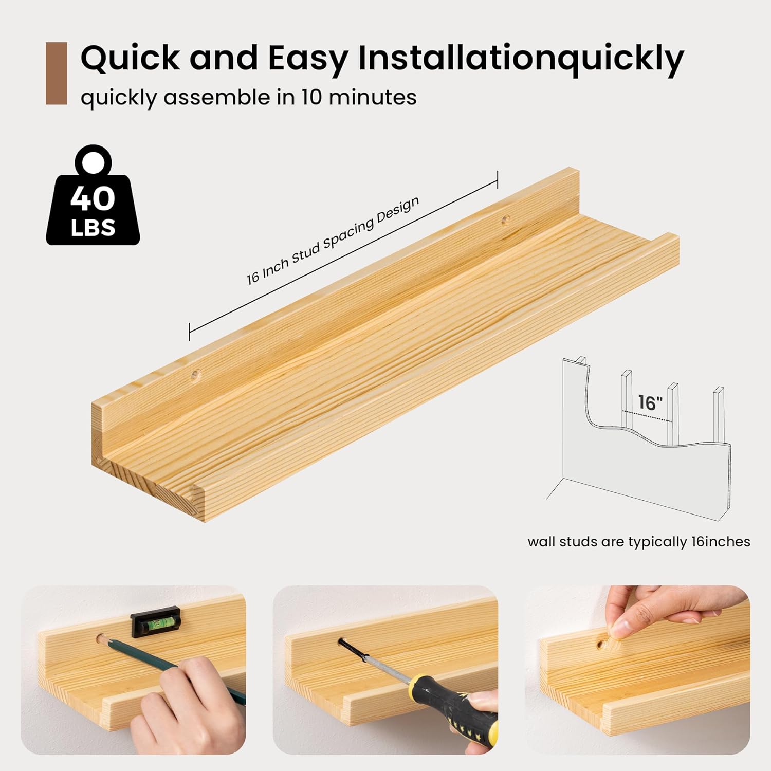 - Unique Solid Pine Wood Shelves: Each picture ledge is meticulously handcrafted from premium solid pine wood, showcasing one-of-a-kind grain patterns, organic color variations, and a hand-finished texture. No two shelves are identical—transform your space with a bespoke touch that reflects your individuality