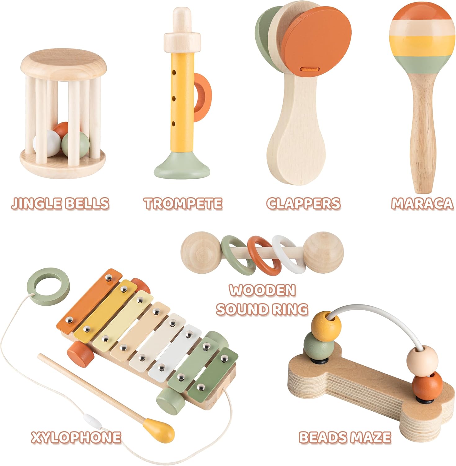 - ๐ฅ๐๐ฒ๐ฉ๐๐ฌ ๐จ๐ ๐ฆ๐ฎ๐ฌ๐ข๐๐๐ฅ ๐ญ๐จ๐ฒ๐ฌ๏ผOur set of musical toys contains a total of 7 musical toys: 1 Car Shaped Xylophone; 1 Clappers; 1 Beads maze; 1 Maraca; 1 Trompete; 1 Wooden sound ring; 1 Jingle Bells, There is also a storage bag for easy organization.A variety of toys are enough for children and you to have fun.